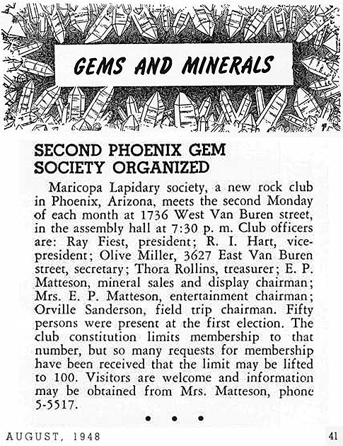 The Maricopa Lapidary Society (MLS) was founded in 1948 by a small group of dedicated lapidaries. It was Phoenix's second gem and mineral society. The club supported the Arizona Mining & Mineral Museum and met at the museum until its closure in May 2011. The MLS currently meets at the North Mountain Visitor Center in Phoenix on the third Tuesday of each month, except in July. In 1952, the MLS held its first annual gem show at the Phoenix Armory. This show would be known as the Phoenix Gem and Mineral Show and continued at various locations, such as the Arizona State Fairgrounds and Mesa Centennial Center for over 50 years.